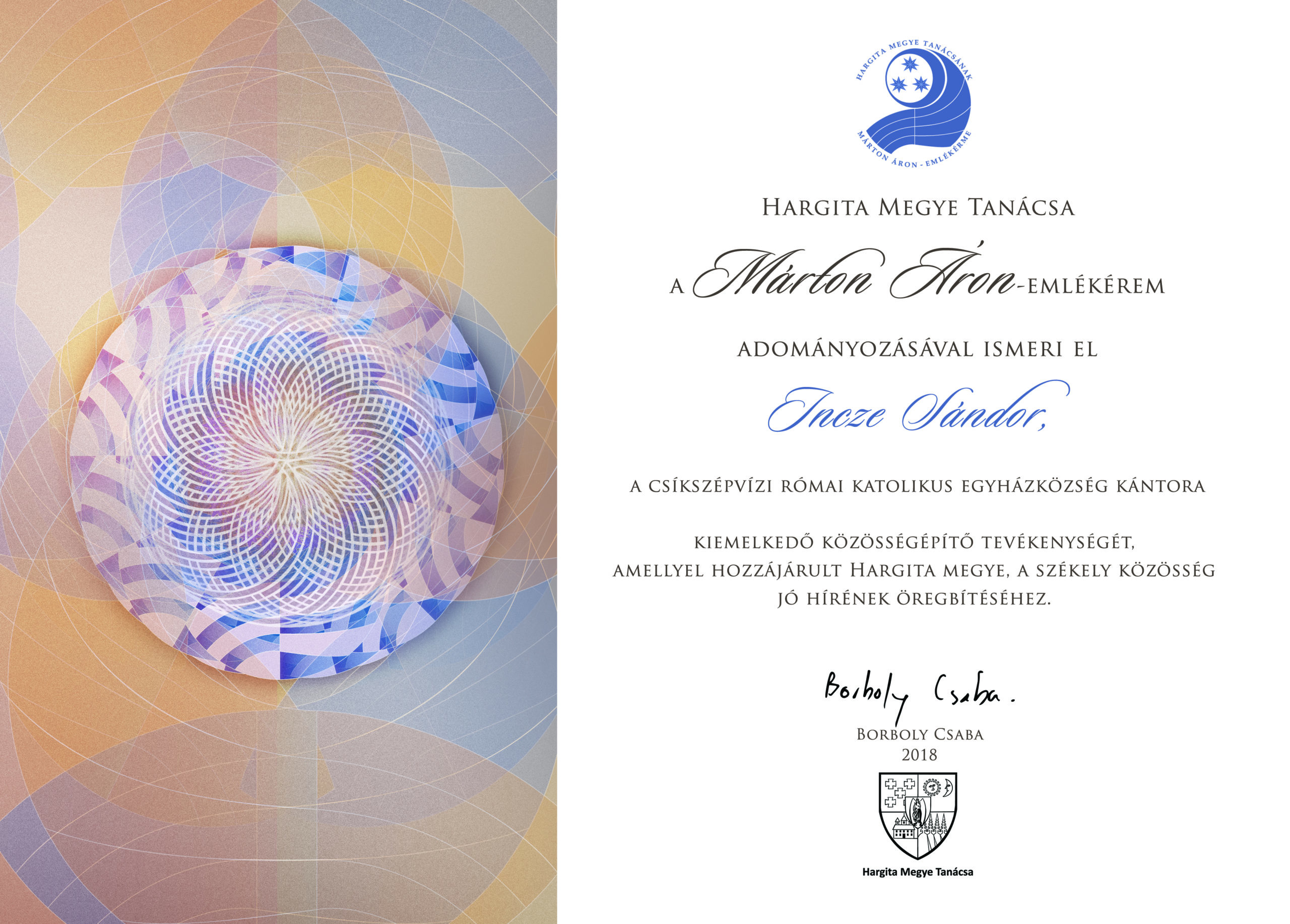 Kiváló érdemeit, kiemelkedő közösségépítő tevékenységéért Hargita Megye Tanácsa a Márton Áron-emlékérem adományozásával ismeri el.